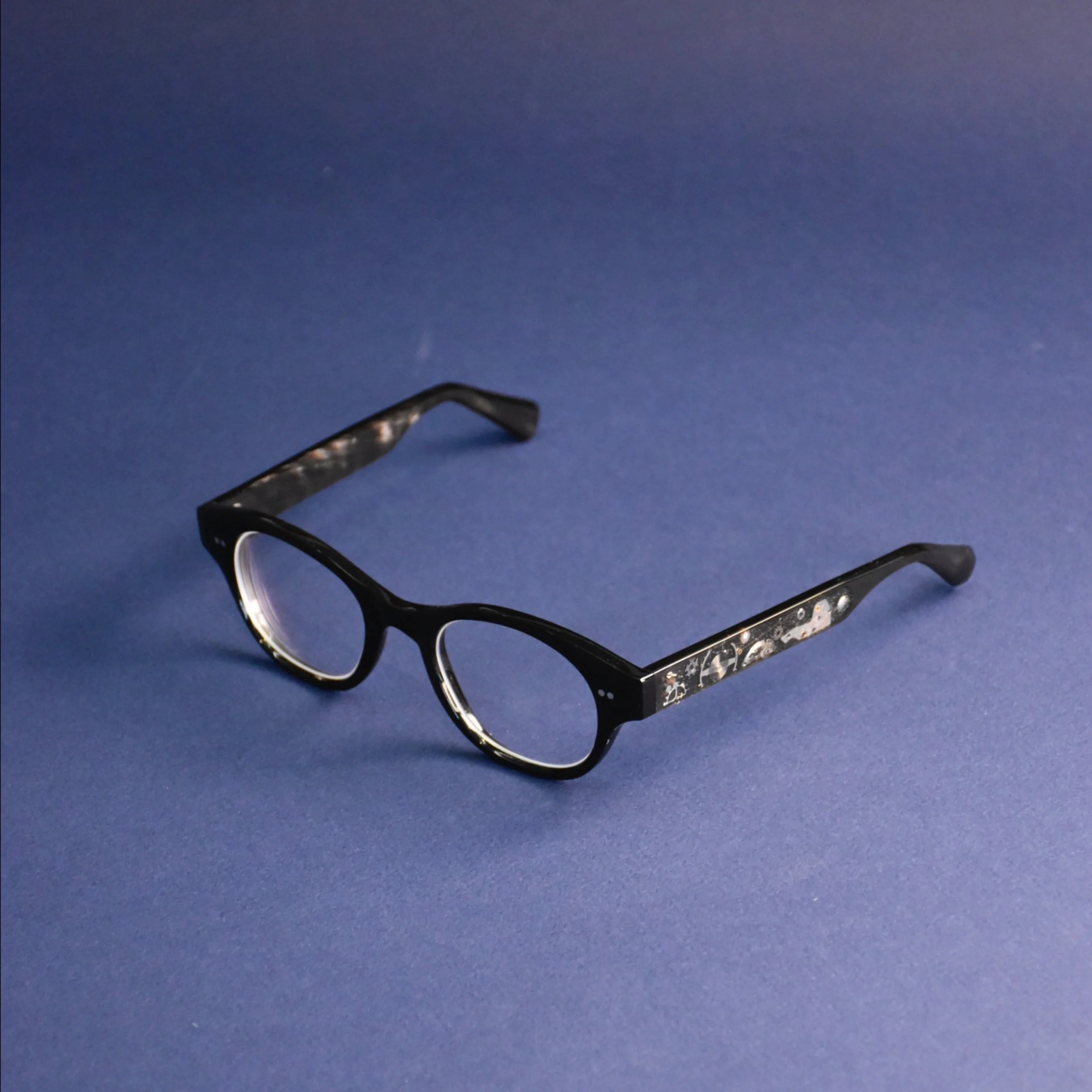 Commandée par un collectionneur de montres du Moyen-Orient, elle incarne une rencontre inattendue : celle de la lunetterie sur mesure et de l’horlogerie mécanique. Dans chaque branche, des composants anciens – rouages, ponts, roues – ont été incrustés dans la corne avec minutie. Non pas comme un effet décoratif, mais comme une manière de capturer une passion, de fixer le temps dans la matière.
